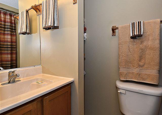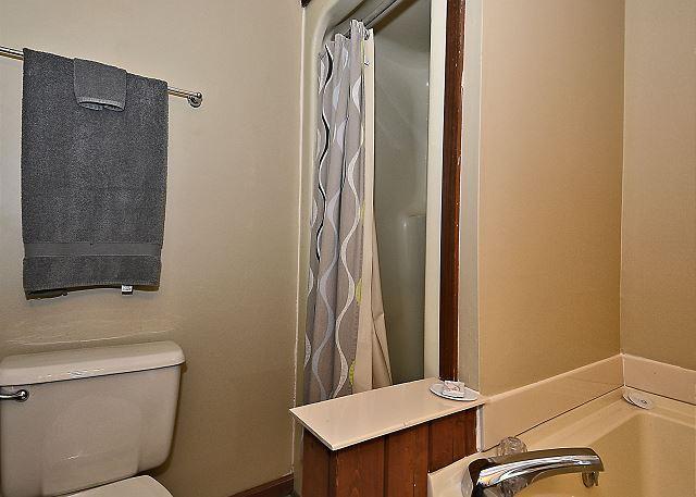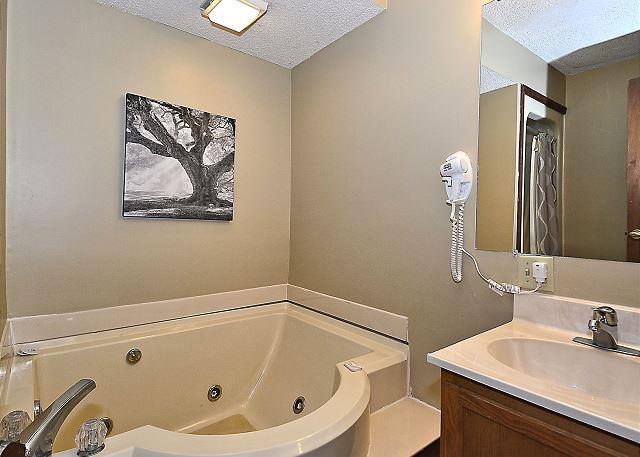 The master suite includes a queen bed and a bathroom with a Jacuzzi tub and shower. The second bathroom includes a tub/shower combo, and both bathrooms come with hairdryers for guest convenience. A washer/dryer and small deck with a grill round out the thoughtful amenities—perfect for enjoying a hot chocolate or glass of wine outdoors.