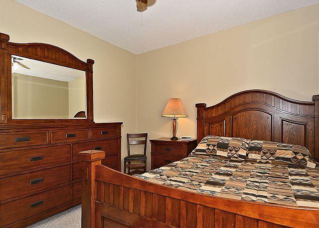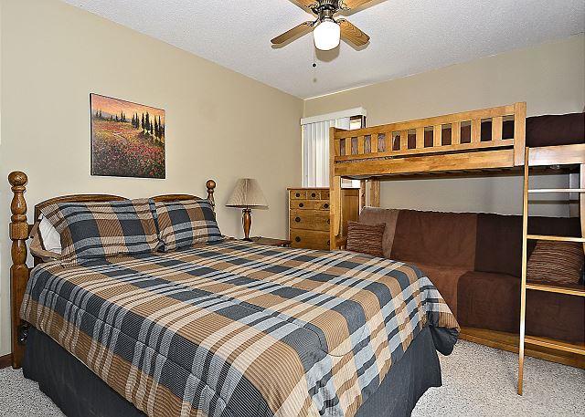 Bedroom 2: Queen bed + bunk bed (full bottom, twin top) + TV