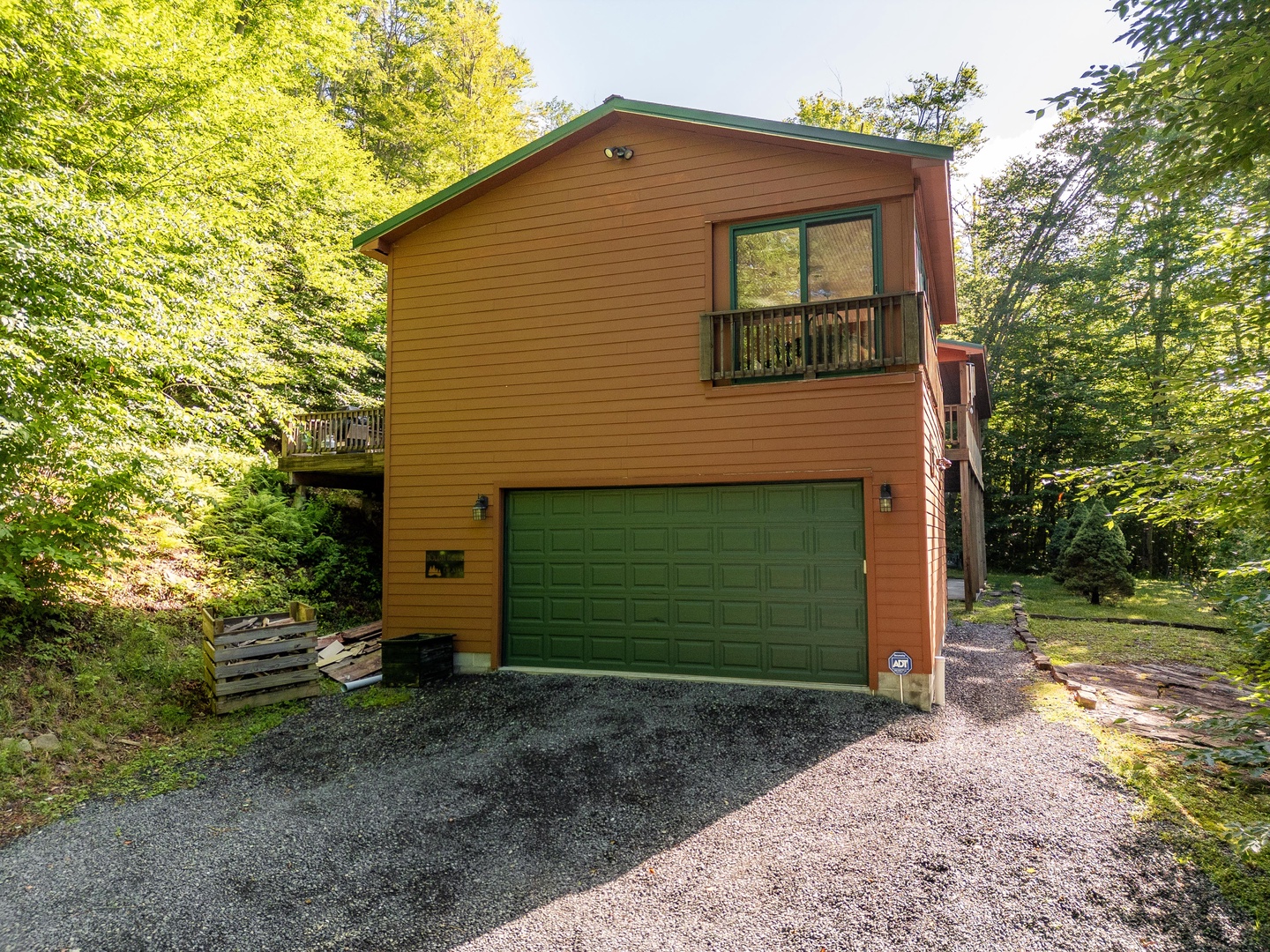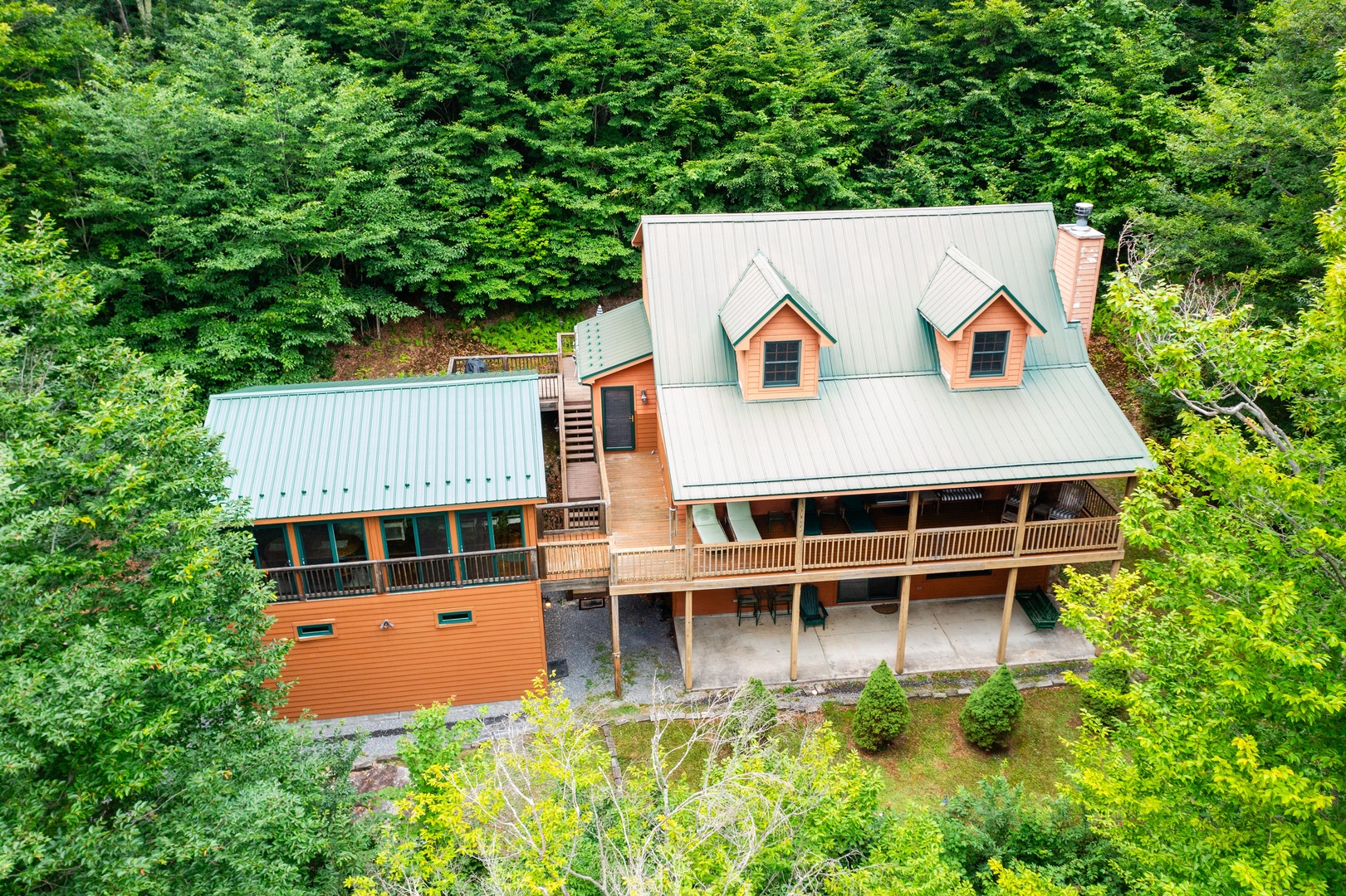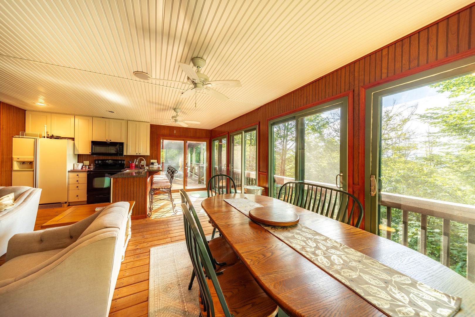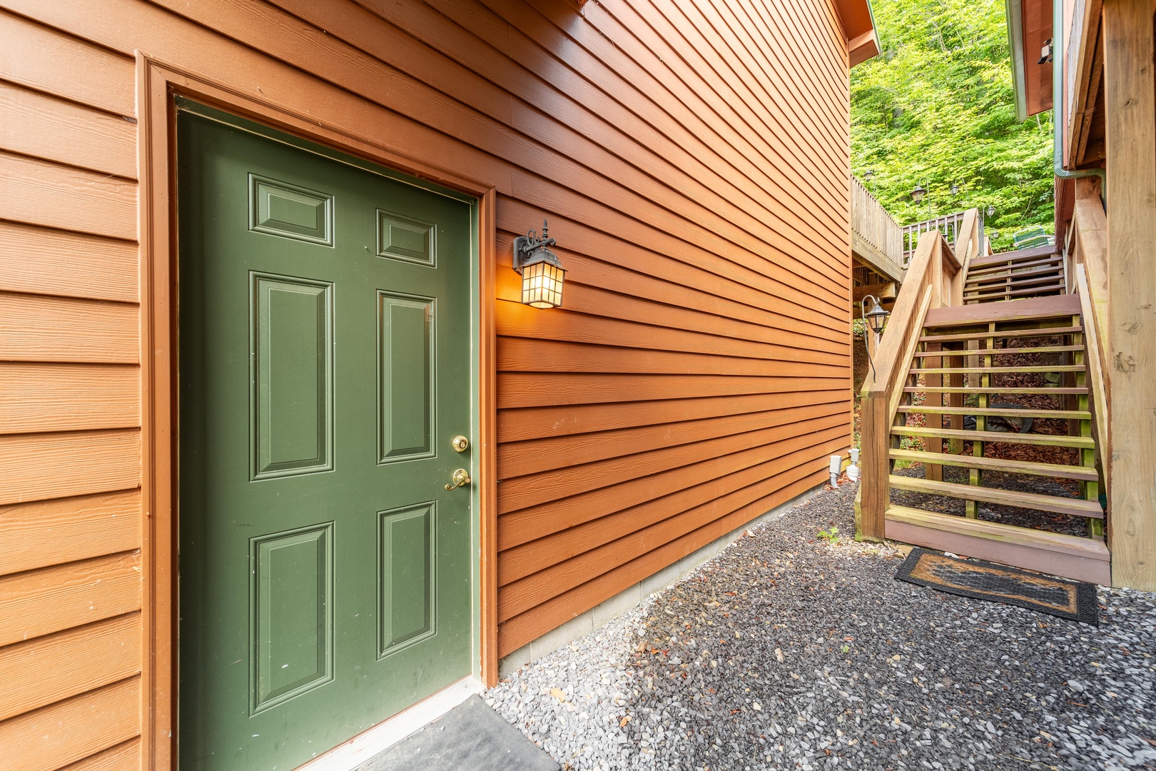 The three-level home allows for plenty of space for spending time together and apart.  The main level includes a Living area with kitchen and dining area, along with a bedroom that has direct access to the deck and hot tub. Lower-level features one bedroom and a bath with jetted tub and a rec area with pool table, television and plenty of board games to entertain. The lower level also has an exterior entrance to an additional porch with seating and a swing. The third floor has two more bedrooms for quiet time.  If the main level and the lower level are too hectic, you can retreat to the detached entertainment suite.