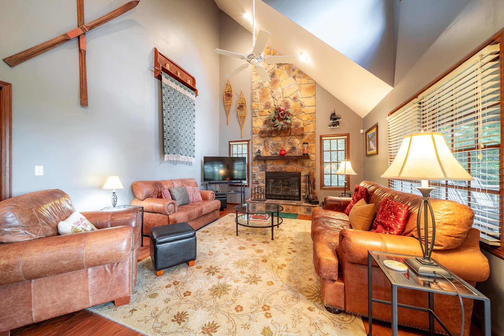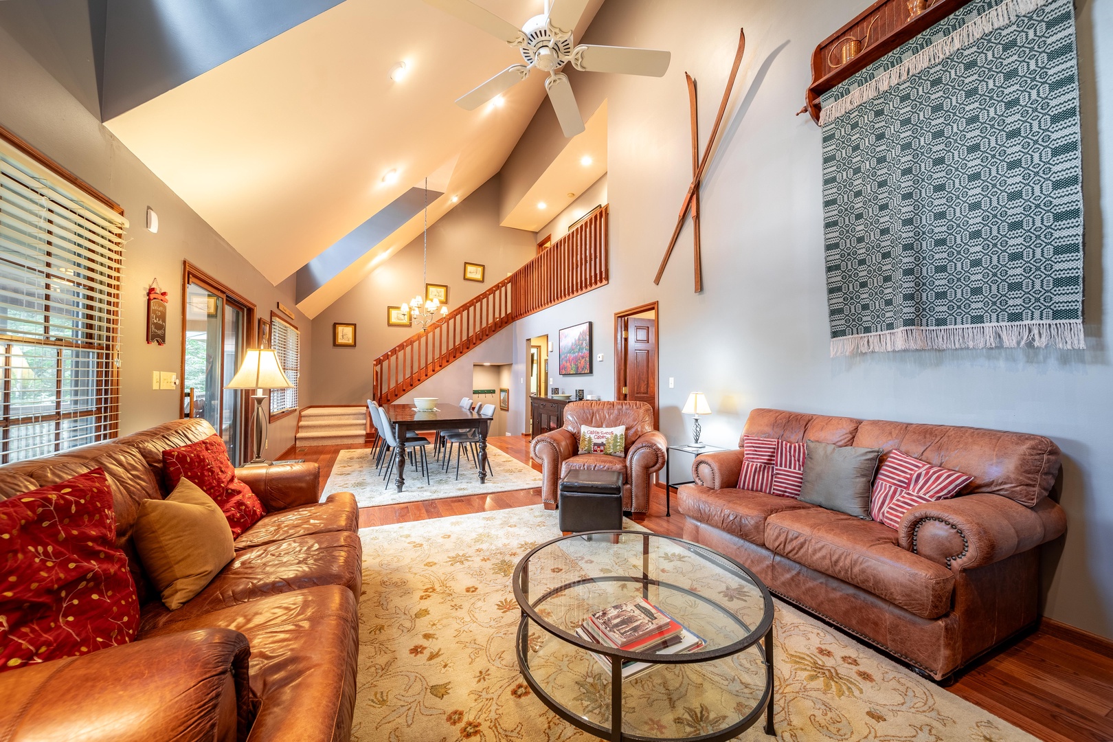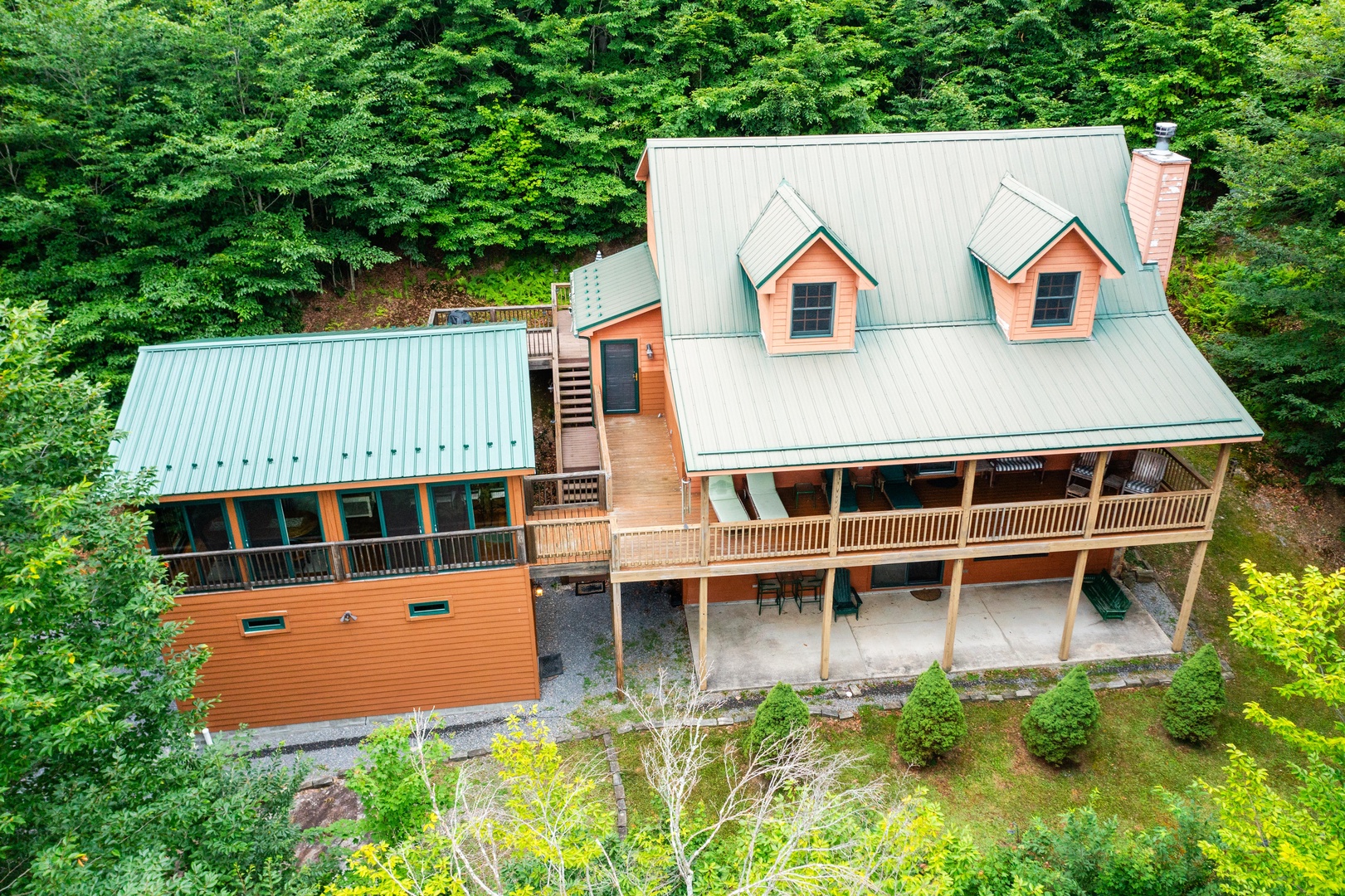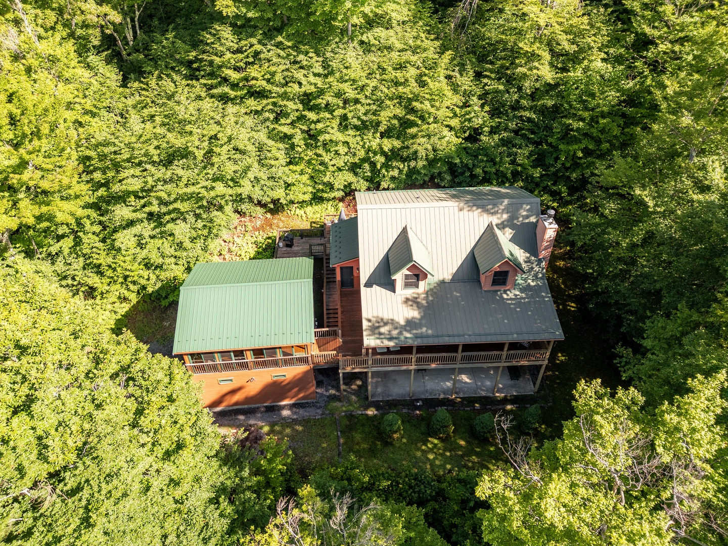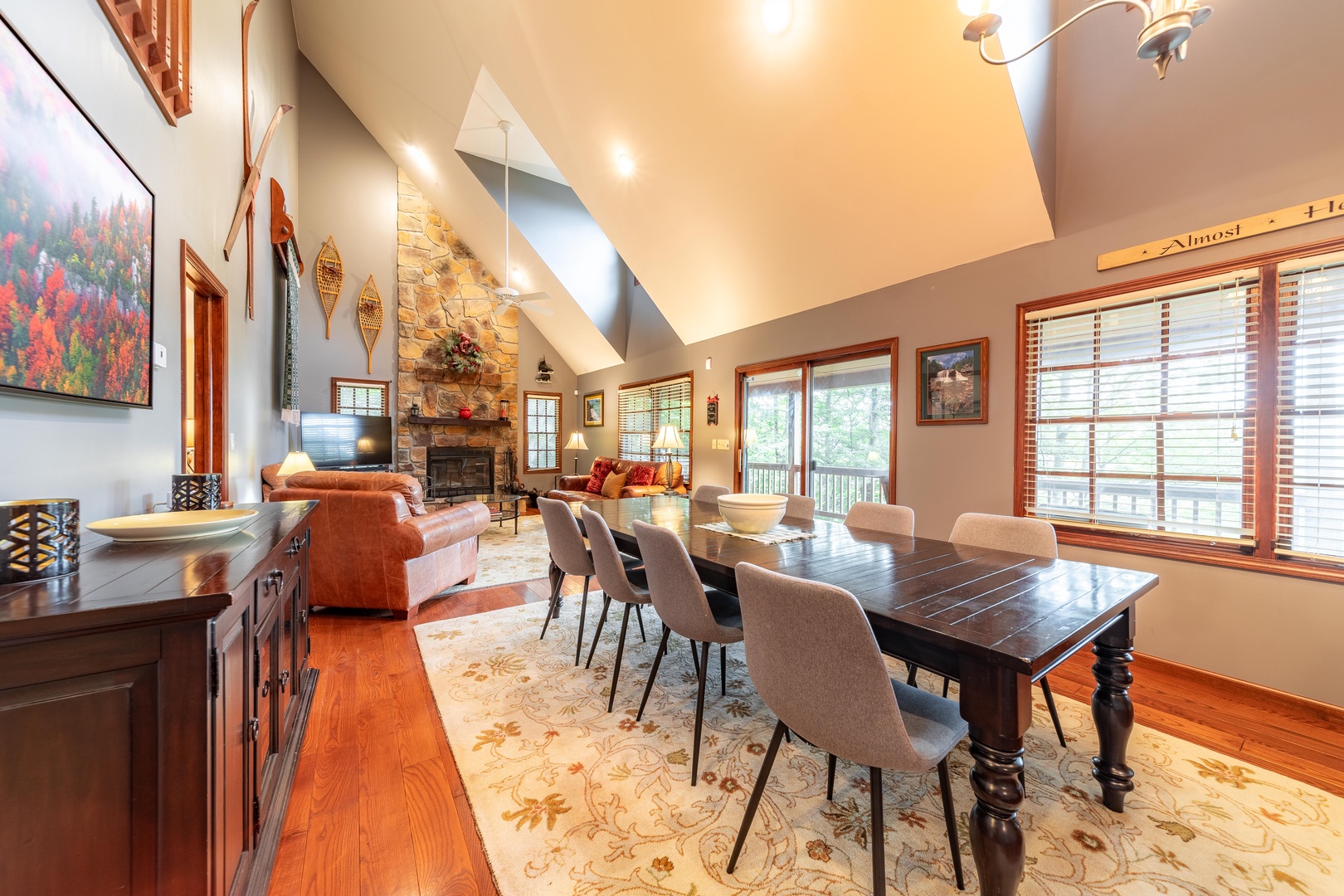 The three-level home allows for plenty of space for spending time together and apart.  The main level includes a Living area with kitchen and dining area, along with a bedroom that has direct access to the deck and hot tub. Lower-level features one bedroom and a bath with jetted tub and a rec area with pool table, television and plenty of board games to entertain. The lower level also has an exterior entrance to an additional porch with seating and a swing. The third floor has two more bedrooms for quiet time.  If the main level and the lower level are too hectic, you can retreat to the detached entertainment suite.