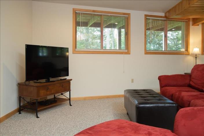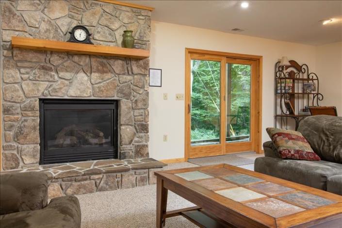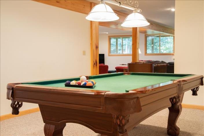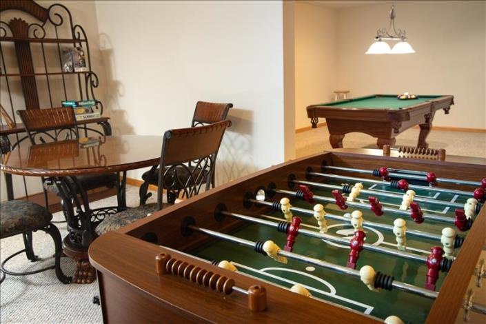 The basement is a full recreation room outfitted with a Billiards table, Foosball, card playing table, TV and sectional couch centered around a gas fireplace.