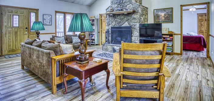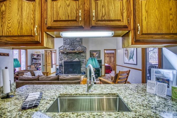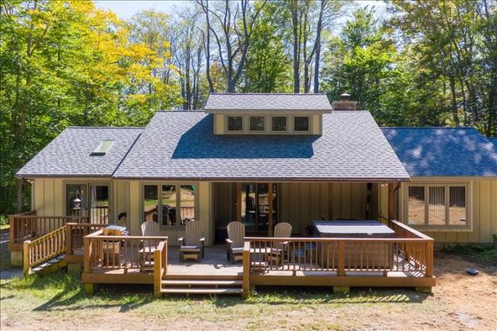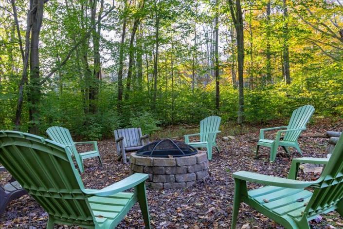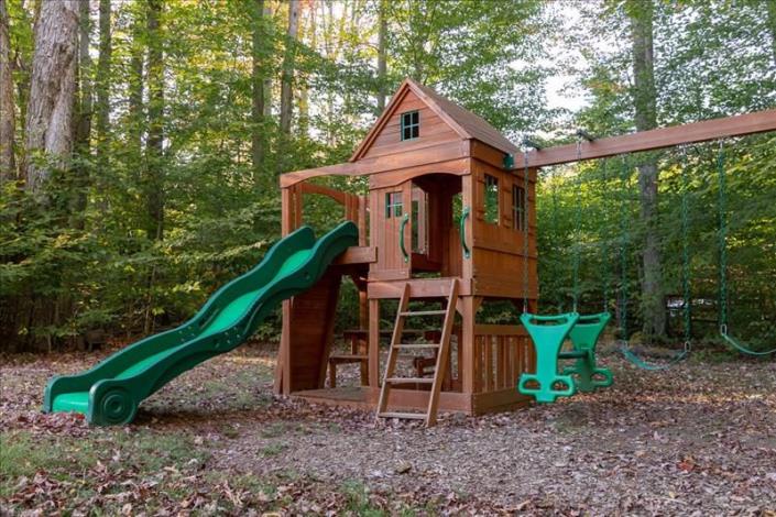 Peace and Quiet await you at Wildlife. Meander through the quiet country roads and view an abundance of wildlife on your way to this 3 beds 2 bath home on a large sunny lot surrounded by trees. Enjoy the outdoor fire pit, children's playground, outdoor hot tub, and lovely sunny decks.  The living room is spacious with cathedral ceilings and a floor to ceiling rock fireplace. Spacious kitchen with new appliances and fully equipped with everything you need.  Home is only a short walk to Sand Run Lake. Owners have provided 2 kayaks and a canoe, paddles and life jackets complimentary to guests.